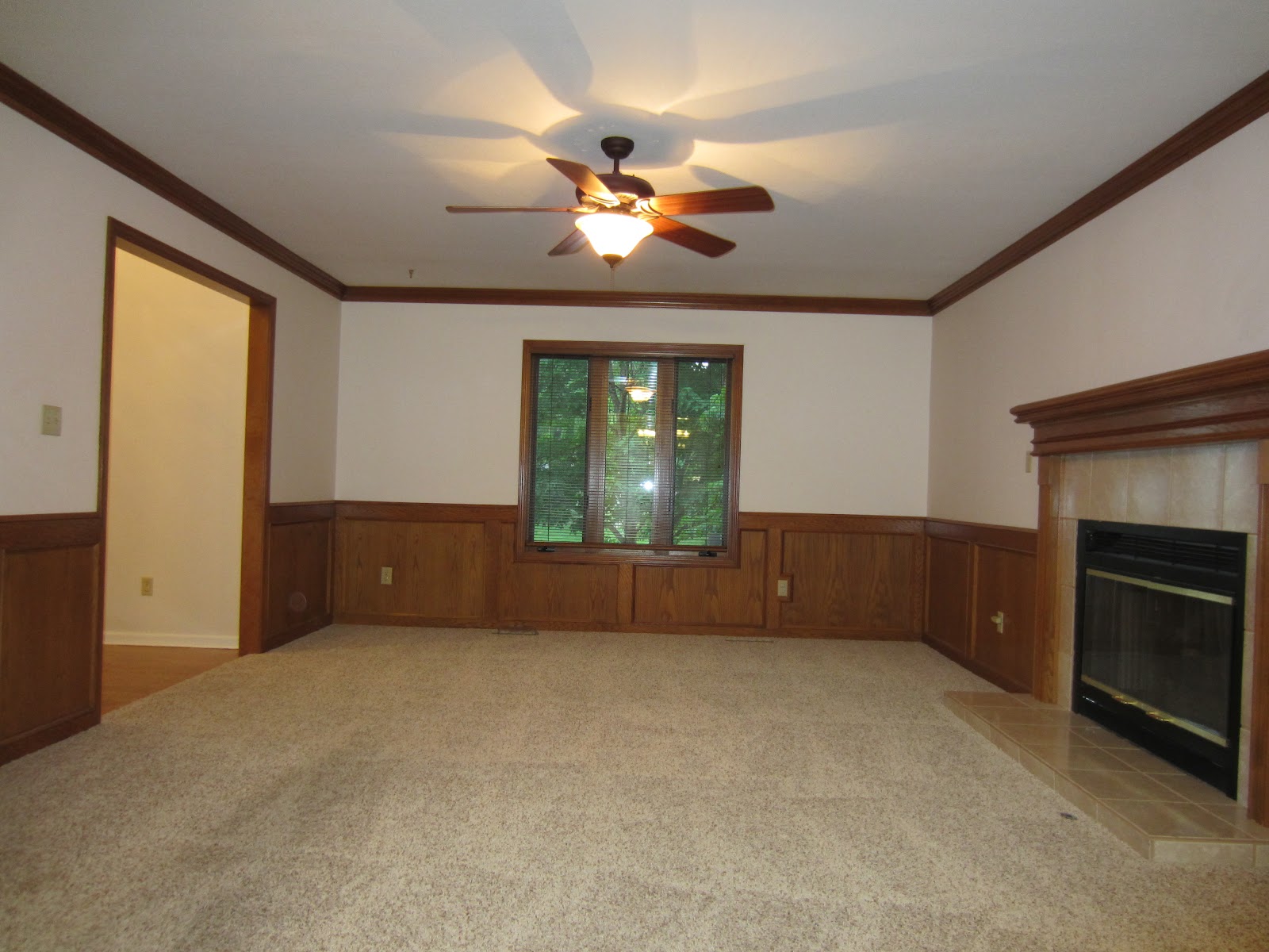 This is going to be the first room to get a makeover. It's in great shape but all that wood trim and wainscoting is just not my style. We're hiring a painter to come in and paint the wainscoting, trim, and fireplace a nice crisp white. Then the walls will get painted a beautiful deep blue, something along the lines of this color: